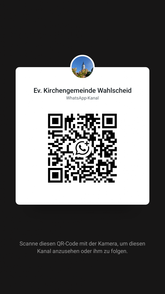 „Ev. Kirchengemeinde Wahlscheid“ eingerichtet. Sie können u.a. QR-Code mit Ihrem Handy scannen und den Kanal abonnieren. Sie können sich auch problemlos wieder abmelden, wenn unsere Informationen für Sie nicht (mehr) von Interesse sind. Die „Abonnenten“ bleiben für alle – auch für uns – anonym. Wir sehen lediglich wie viele Personen den Kanal abonniert haben.