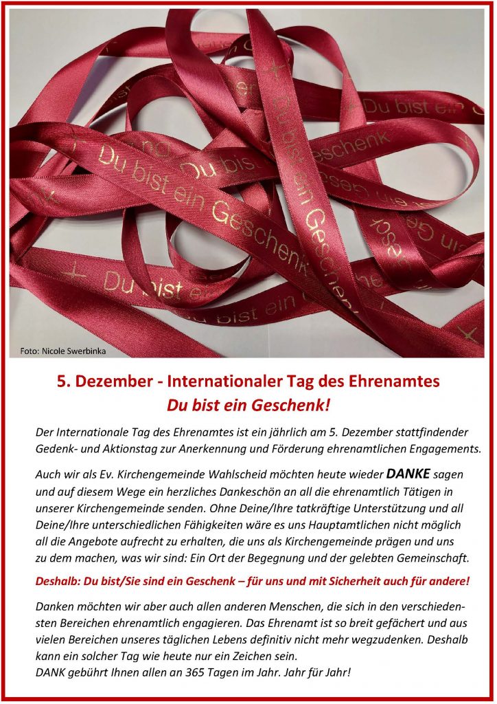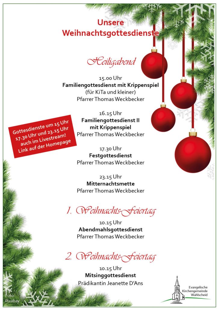 Bitte melden Sie sich bis 15.12. per Mail oder telefonisch im Gemeindebüro an, damit wir den Vormittag besser planen können. Mail: wahlscheid@ekir.de, Tel.: 02206.5035