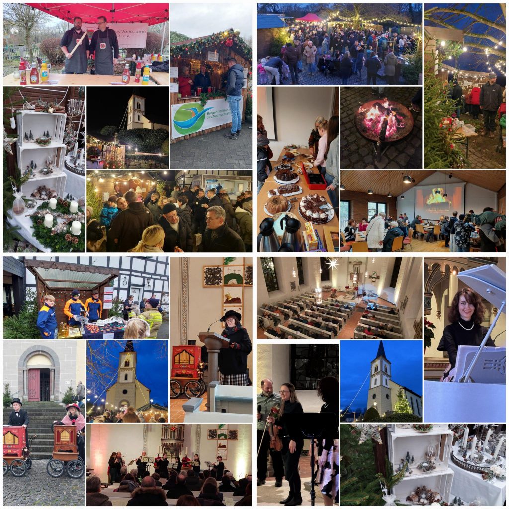 … oder besser: Uns fehlen die Worte. Was für ein großartiges 1. Adventswochenende. Fand doch auch in diesem Jahr rund um die Ev. St. Bartholomäuskirche in Wahlscheid wieder unser traditioneller Nikolausmarkt statt. Zum Auftakt gab es am Samstag ein Konzert mit Klavier und Geige. Unsere neue Kantorin Xenia Ielnikova präsentierte gemeinsam mit Katja Suglobina (Geige) Stücke von Bach, Wagner, Chopin, Vivaldi…. Einfach nur WOW! Zum Abschluss waren die Konzertbesucher*innen zum gemeinsamen Weihnachtsliedersingen eingeladen. Während in der Kirche noch gesungen wurde, war der Nikolausmarktbetrieb auf dem Kirchvorplatz schon in vollem Gange.