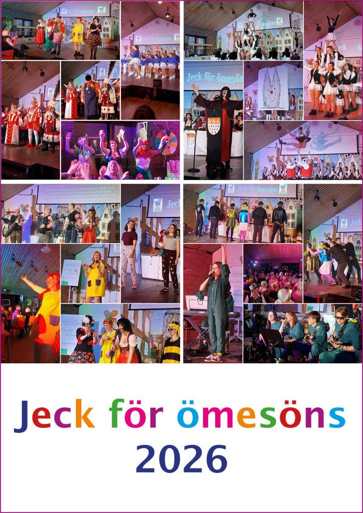 Ein ganz großes Dankeschön möchten wir auf diesem Wege noch mal an das Team von „Jeck för ömesöns“ richten, an alle die, die sich in vielen Stunden Arbeit daran gemacht haben, die Karnevals-Sitzung vorzubereiten, dafür einzukaufen, zu basteln, zu dekorieren, zu kochen, Auftritte einzustudieren, Terminabsprachen zu Treffen, die Technik auf- und auch wieder abzubauen, die Anwesenden mit Snacks und „Flüssigkeiten“ zu versorgen und, und, und – DANKE!