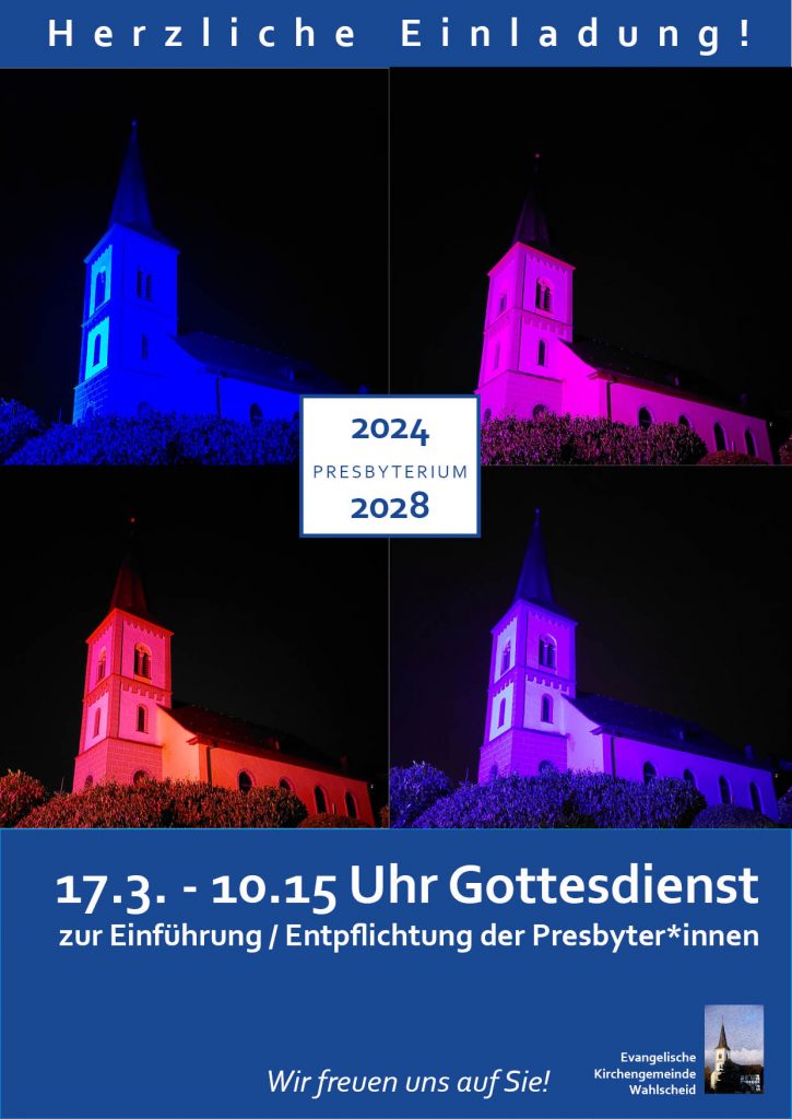 In der Gemeindeversammlung am 18.2.24 wurde das Presbyterium für die Amtsperiode 24-28 gewählt. Die Einführung des neuen Presbyteriums findet im Gottesdienst am 17.3.24 statt. Hierzu möchten wir Sie schon jetzt herzlich einladen. In diesem Gottesdienst werden auch die ausscheidenden Presbyter der aktuellen Amtsperiode entpflichtet.