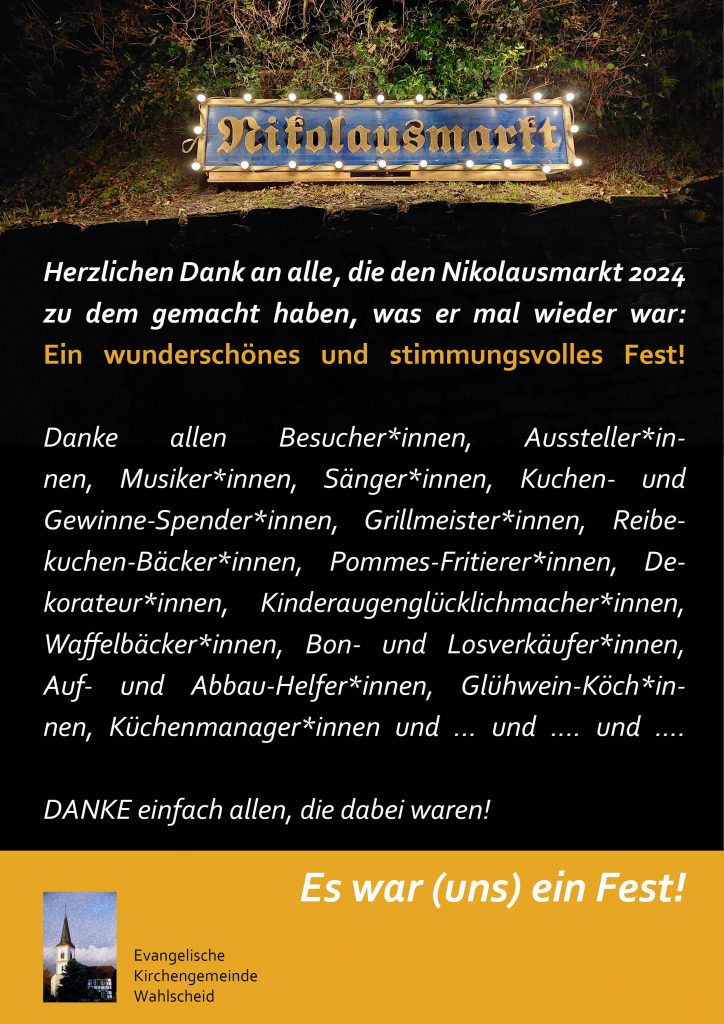 Ein herzliches Dankeschön geht ebenfalls an die vielen Besucher, die es uns letztlich erst möglich gemacht haben, dass wir auch in diesem Jahr einen beachtlichen Betrag für einen guten Zweck spenden können. In seiner November-Sitzung hat das Presbyterium beschlossen, den Erlös des diesjährigen Nikolausmarktes dem Verein ZWEITZEUGEN zu Gute kommen zu lassen. ZWEITZEUGEN e.V. ermutigt und befähigt (junge) Menschen, durch das Weitergeben der Geschichten von Überlebenden des Holocaust selbst zu zweiten Zeug*innen, zu Zweitzeug*innen zu werden und sich gegen Antisemitismus und andere Diskriminierungsformen im Heute einzusetzen.