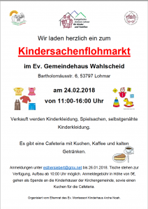Kindersachenflohmarkt der Kinderhäuser Posted on24. Januar 201825. April 2018AutorRamona Christ-Köhler Am 24.02.2018 findet von 11:00 bis 16:00 Uhr im Ev. Gemeindehaus in Wahlscheid der Kindersachenflohmarkt der beiden Kinderhäuser der Kirchengemeinde statt. Kommen Sie vorbei.